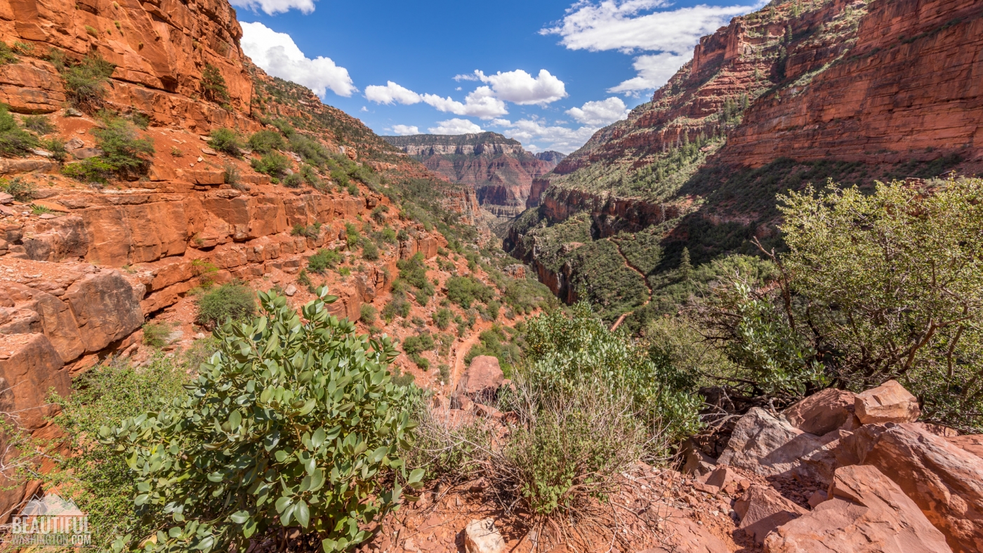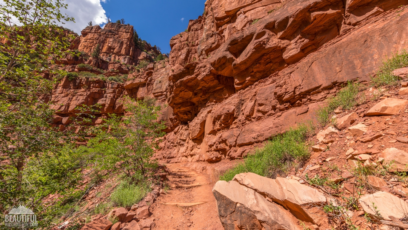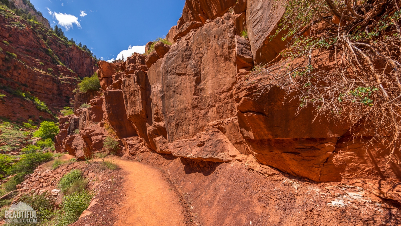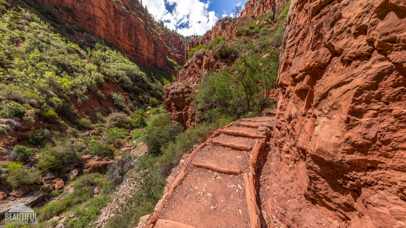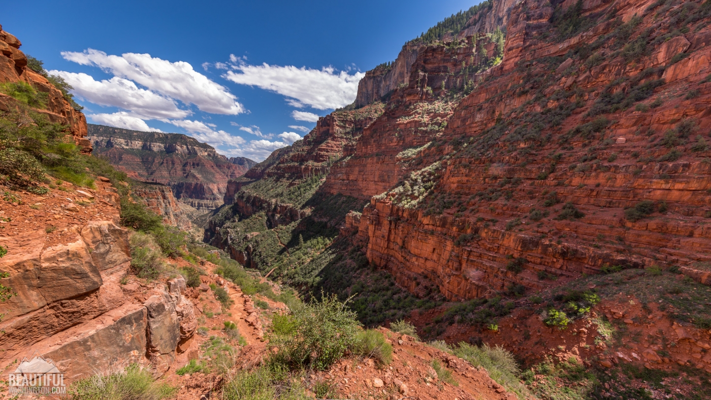 The Roaring Springs is a wonderful place with remarkable views, where water spurts from the cliffs giving an origin to Bright Angel Creek. The Roaring Springs is the last point on the North Kaibab Trail, recommended as a day-hike. Here you may chose any of 2 options. You may turn back and climb up the same trail you just came here thus finishing your day-hike. Or you can walk about two more miles and overnight at a Cottonwood Campground (one of 2 campgrounds, available on the North Kaibab Trail). But to overnight at any of these campgrounds you need to receive a permit from the Grand Canyon National Park Backcountry Information Center. And any at-large camping is strictly forbidden on the North Kaibab Trail.