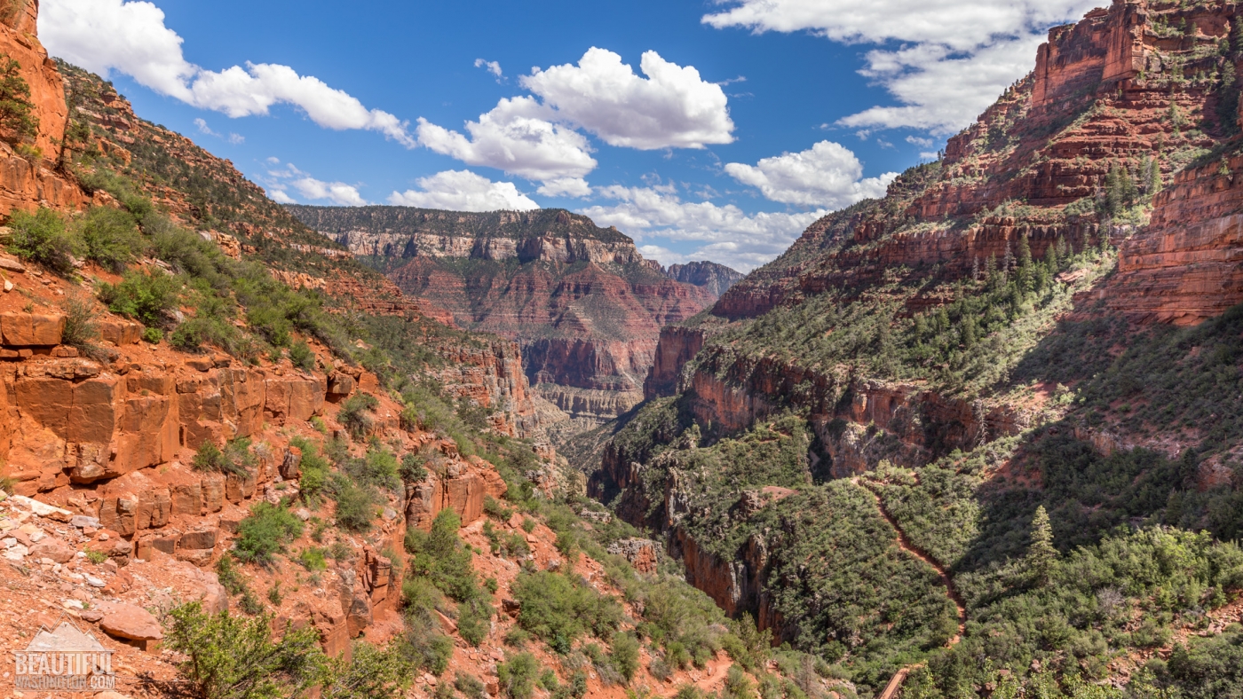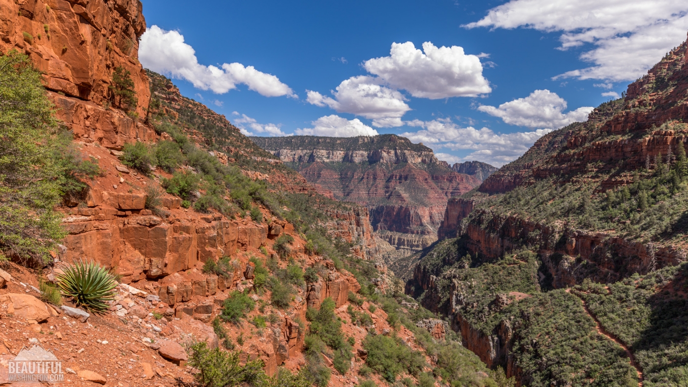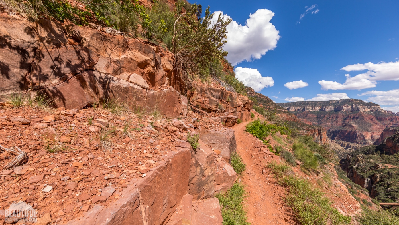 One of the most popular trails of the North Rim is the North Kaibab Trail. It’s a spectacular 14 ml trail (one way), showing the hikers the diversity of fauna, starting from fir-trees, aspens, ferns and various wildflowers at its beginning at the top, and finishing with some riparian and desert vegetation coming closer to the canyon’s bottom. It’s the only trail on the North Rim that will take you down to the very bottom of the canyon – Colorado River. It’s also the only maintained trail of the North Rim. But do not let this fact to mislead you! Being maintained doesn’t make this trail an easy one. Don’t forget to consider a great elevation change and the fact that the path is often in full sun… It’s really quite easy when you walk down, but coming back up the trail is rather strenuous. And don’t forget, the lower you are going, the higher becomes the temperature.