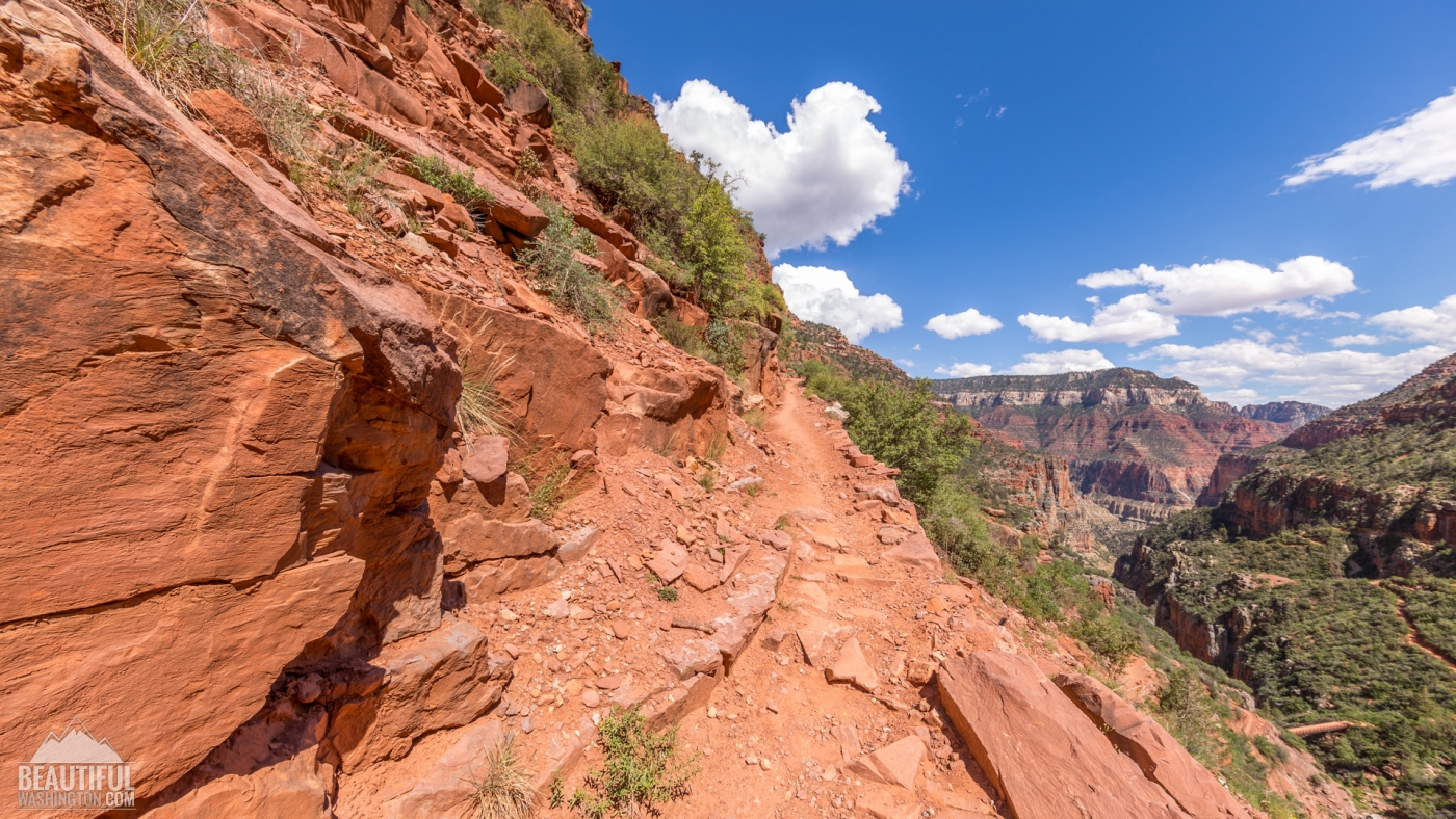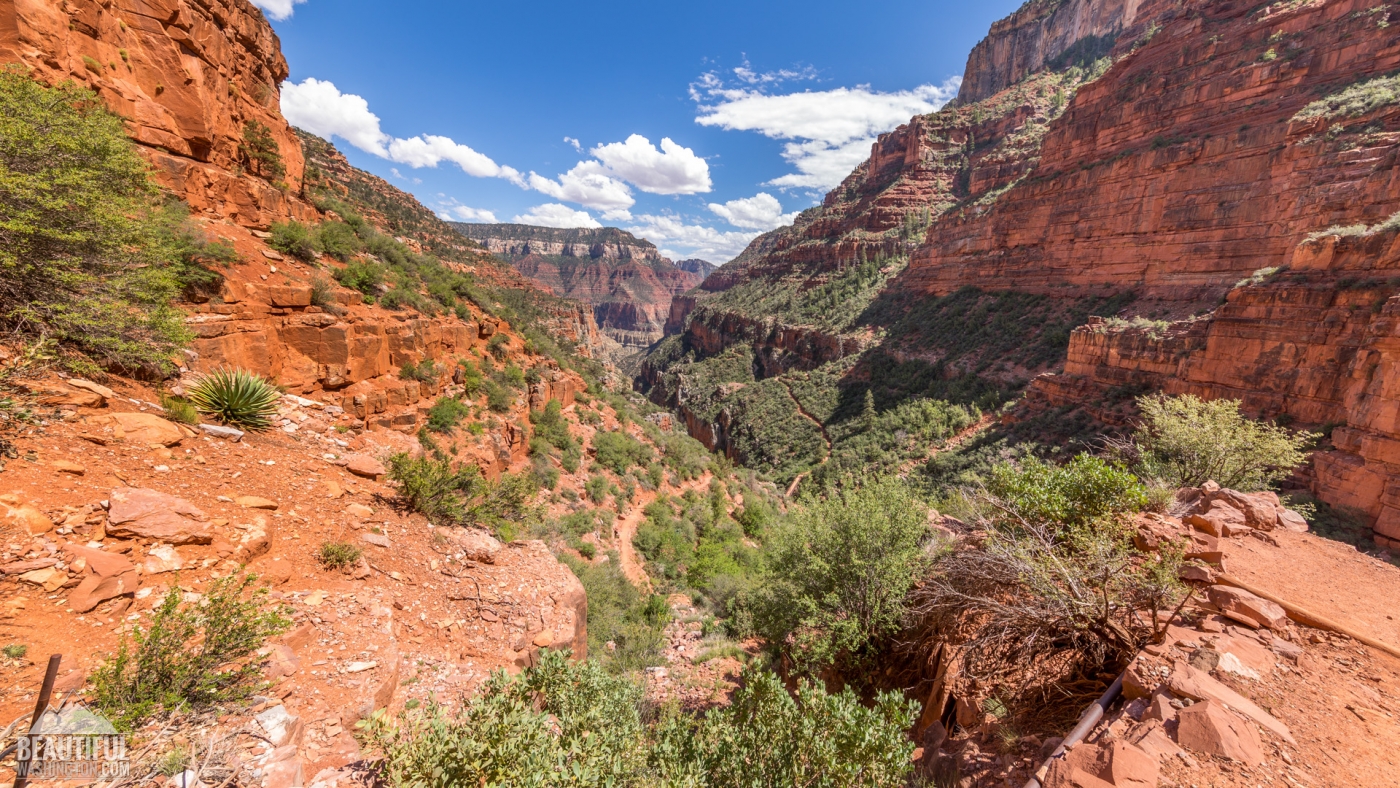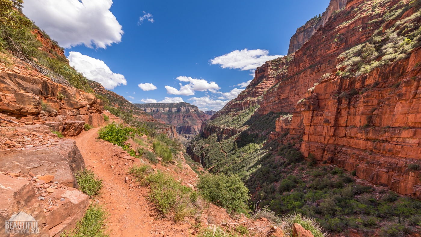 One of the most popular trails of the North Rim is the North Kaibab Trail. It’s a spectacular 14 ml trail (one way), showing the hikers the diversity of fauna, starting from fir-trees, aspens, ferns and various wildflowers at its beginning at the top, and finishing with some riparian and desert vegetation coming closer to the canyon’s bottom. It’s the only trail on the North Rim that will take you down to the very bottom of the canyon – Colorado River. It’s also the only maintained trail of the North Rim. But do not let this fact to mislead you! Being maintained doesn’t make this trail an easy one. Don’t forget to consider a great elevation change and the fact that the path is often in full sun… It’s really quite easy when you walk down, but coming back up the trail is rather strenuous. And don’t forget, the lower you are going, the higher becomes the temperature.