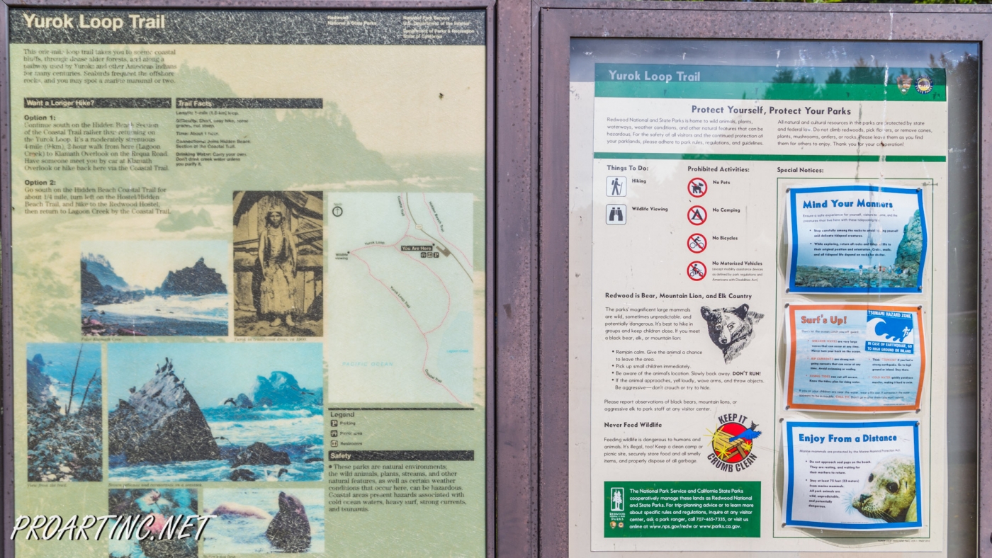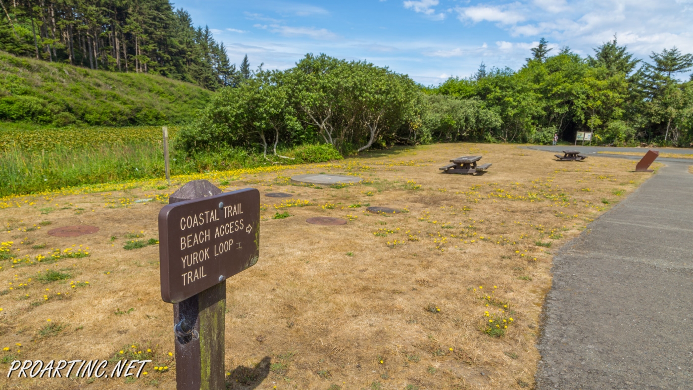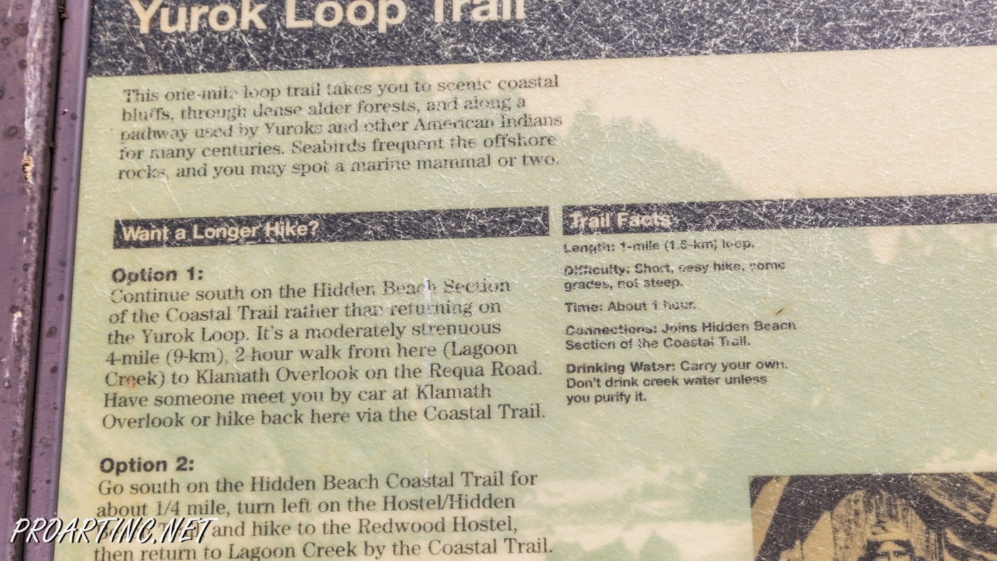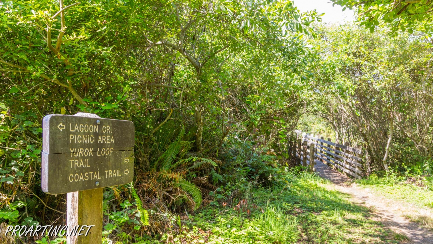 The best way to start hiking the Hidden Beach Section of the Coastal Trail is from the Lagoon Creek parking area. The parking lot is overlooking a nice Lagoon Pond the surface of which is half covered by water lilies. This parking area (also known as Lagoon Creek Picnic Area) has restrooms, picnic tables and information stands, providing the visitors with some data about the Yurok Loop Trail, which will be the beginning of the hike.