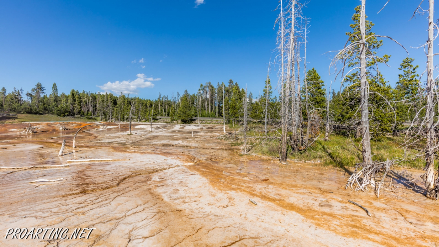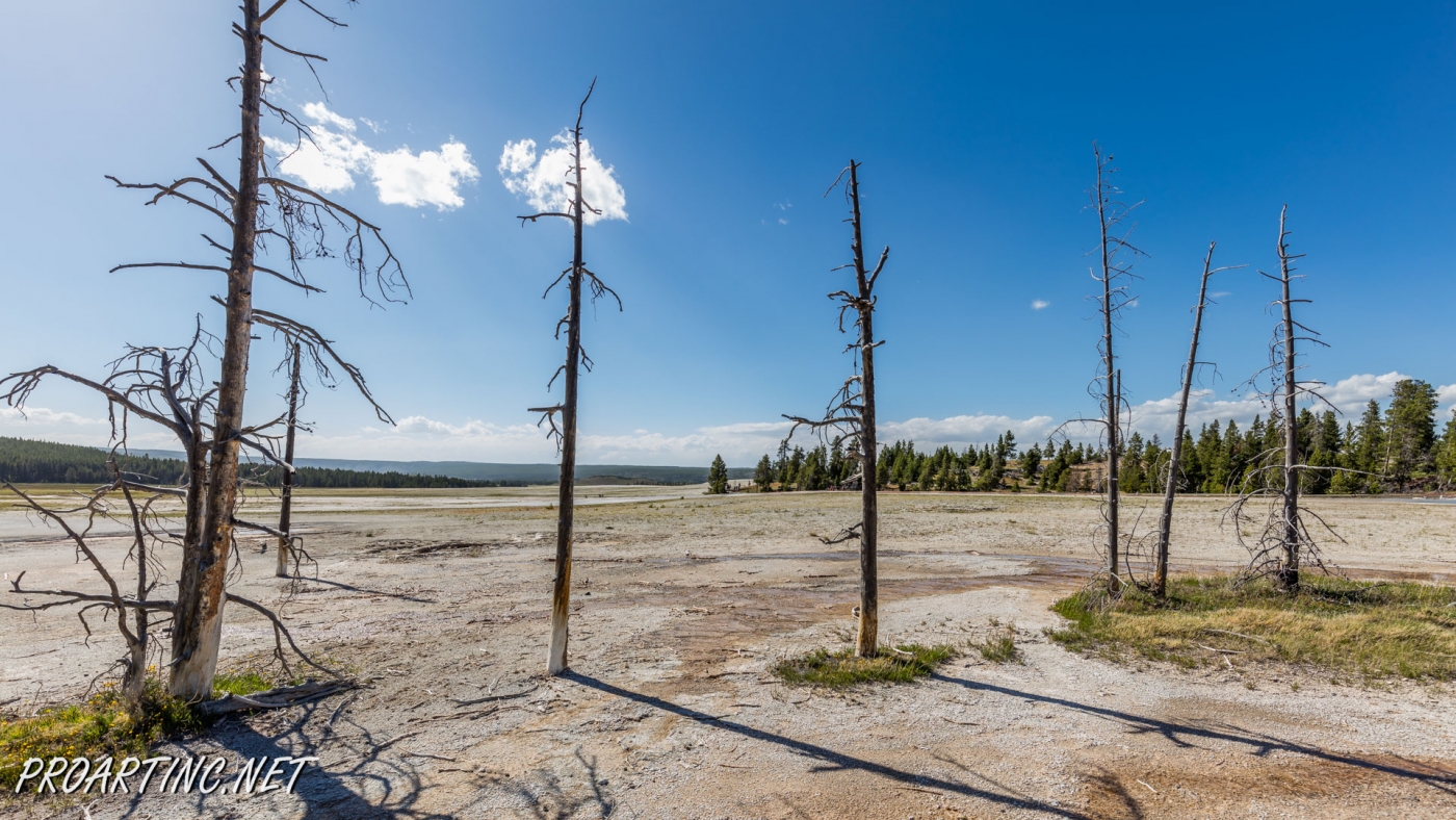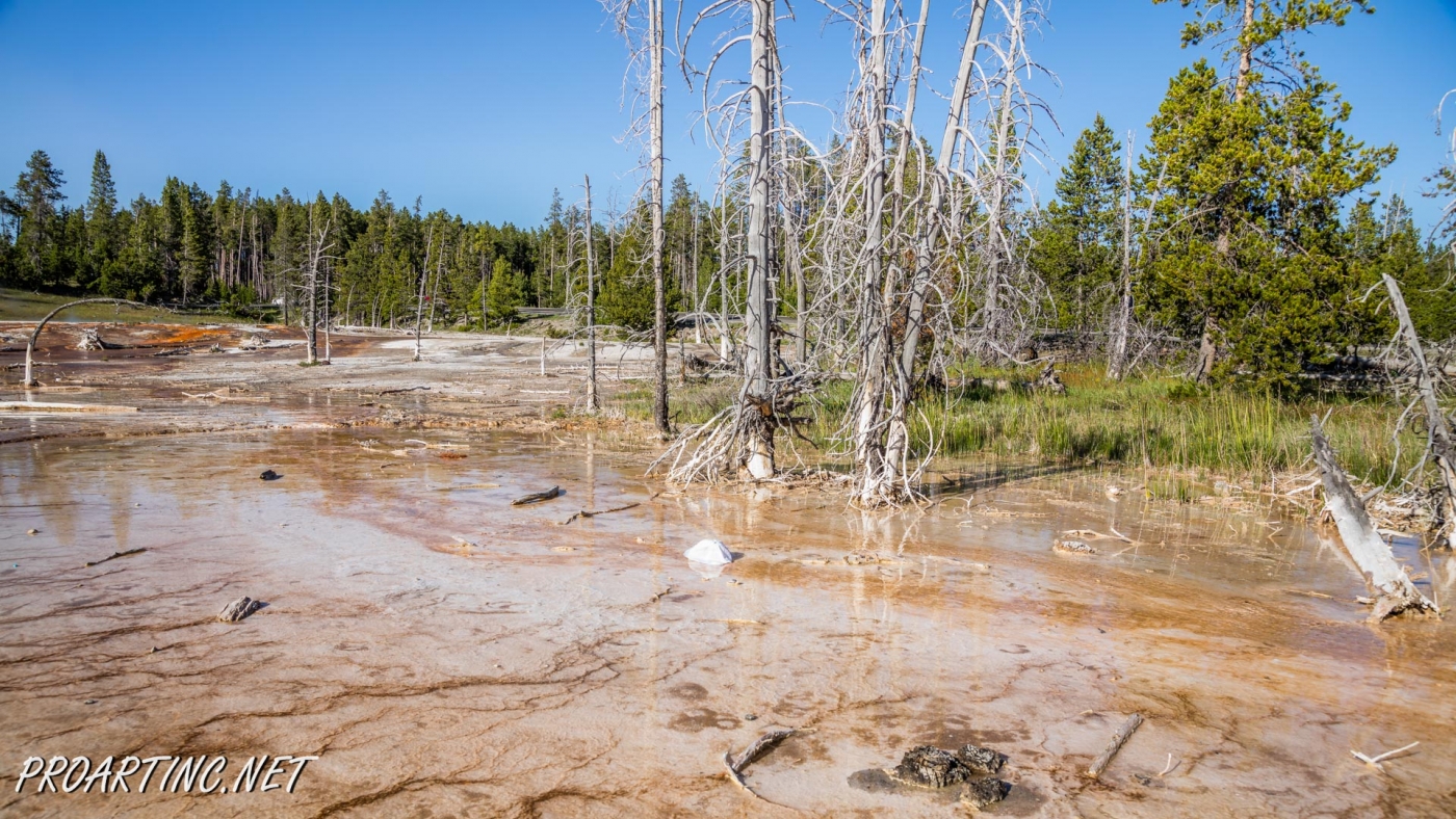Other interesting feature of this area is dead lodgepole pine trees that didn’t survive. The trees drowned when nearby hot springs shifted. Silica also penetrated the trees and hardened their bases.