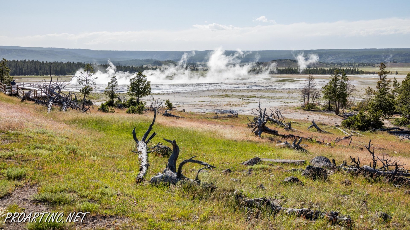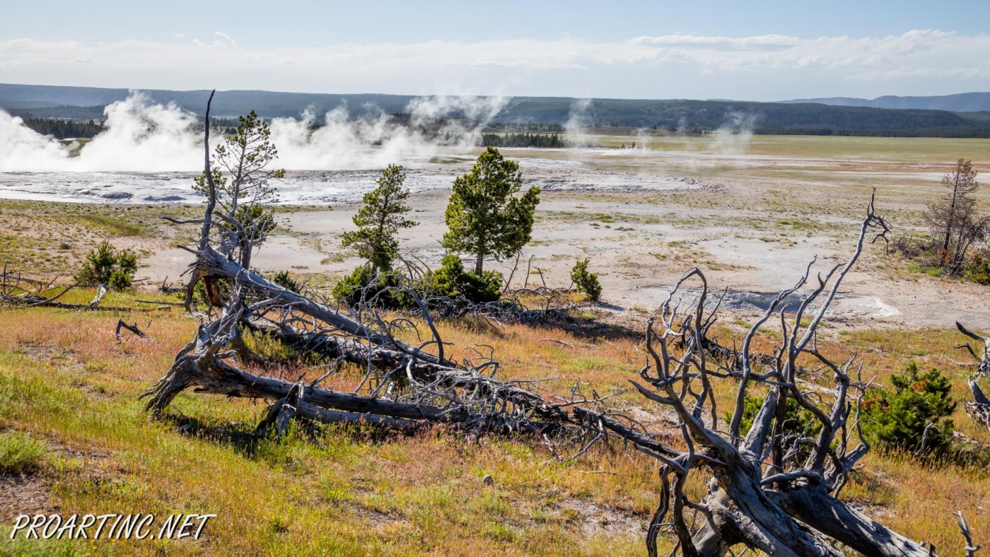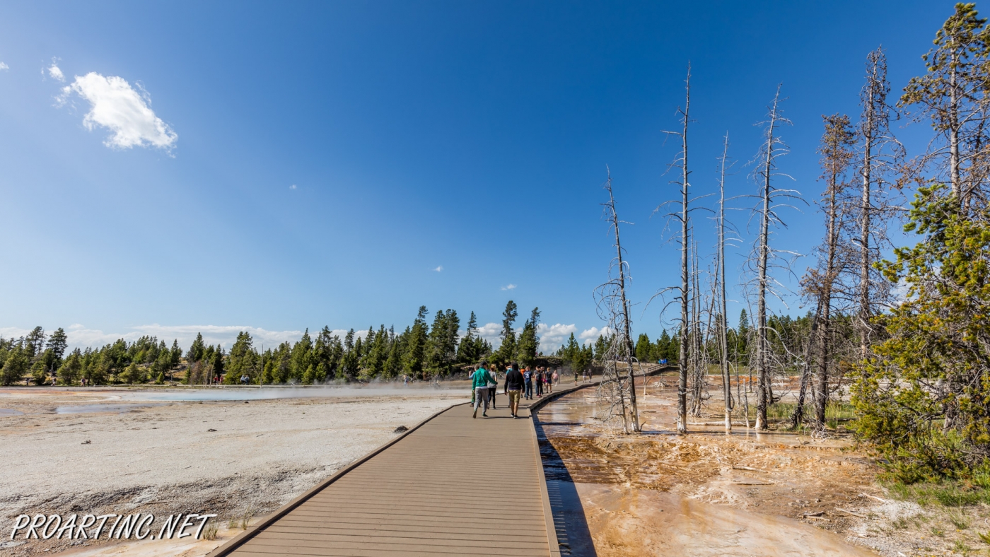 Other interesting feature of this area is dead lodgepole pine trees that didn’t survive. The trees drowned when nearby hot springs shifted. Silica also penetrated the trees and hardened their bases.