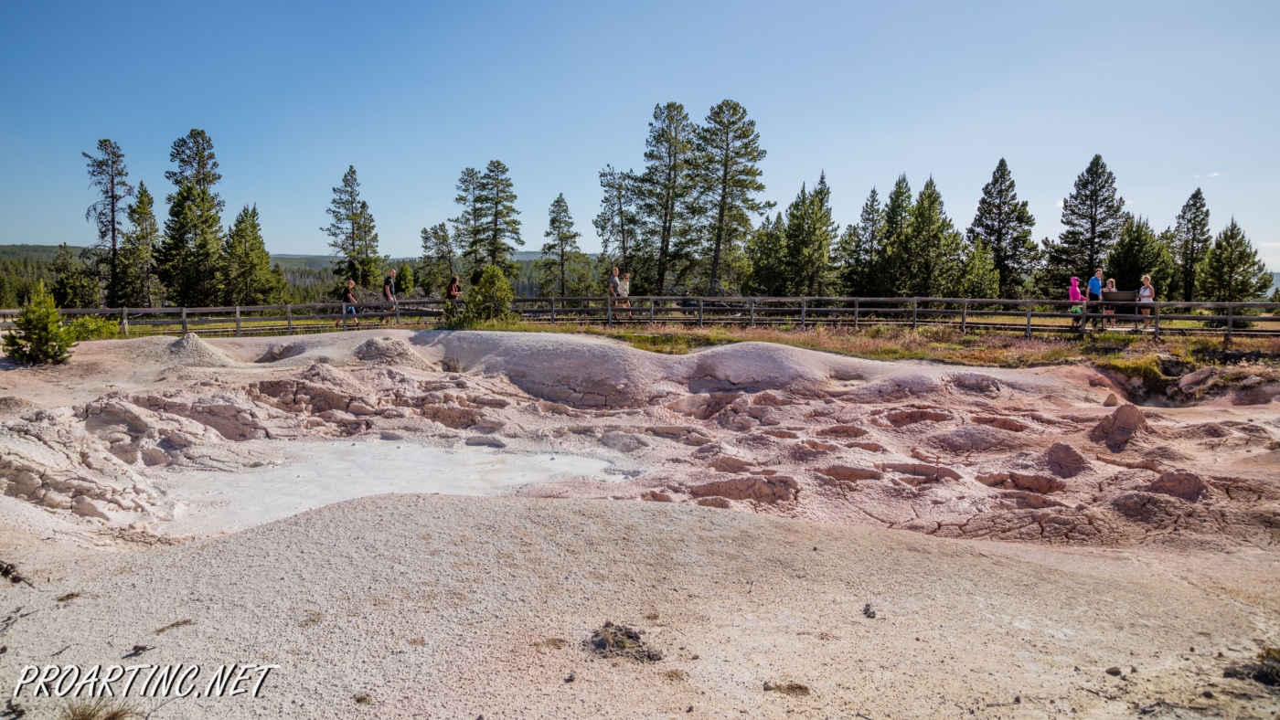 Fountain Paint Pots was originally named “Mud Puff” in 1871 by Hayden survey, but later guide books referred to this area as Fountain Geyser and Paint pots, and in 1927 the name was changed. It was also named for the red, yellow and brown color of the mud in this area. The colors are so different because oxidation states of iron in the mud differ from feature to feature. The heat in the caldera forces pressurized water to go out, as well as rising gases cause the bubbling effect. It should be noted that the most active state of the pots and the bubbles are in spring, because snow melting provides more water, in summer the mud dries up and becomes thicker.