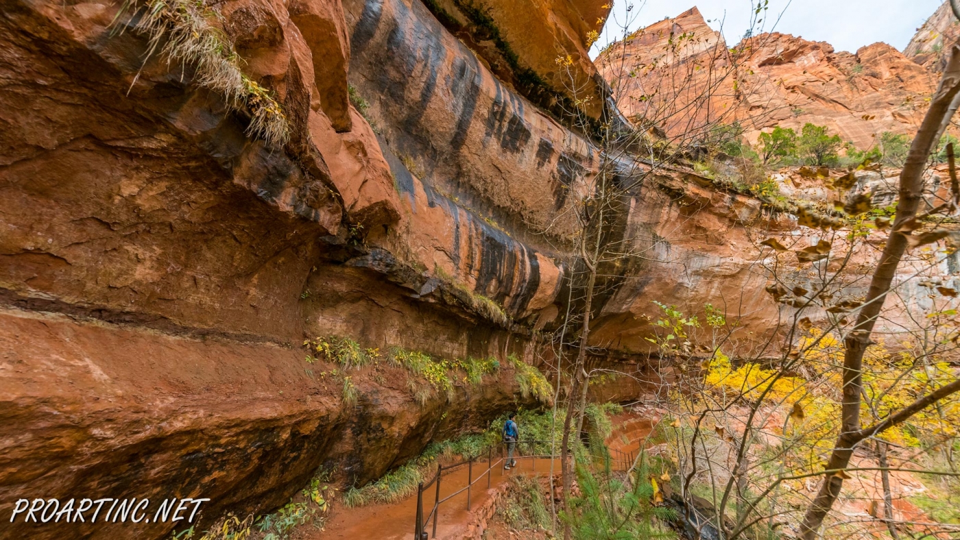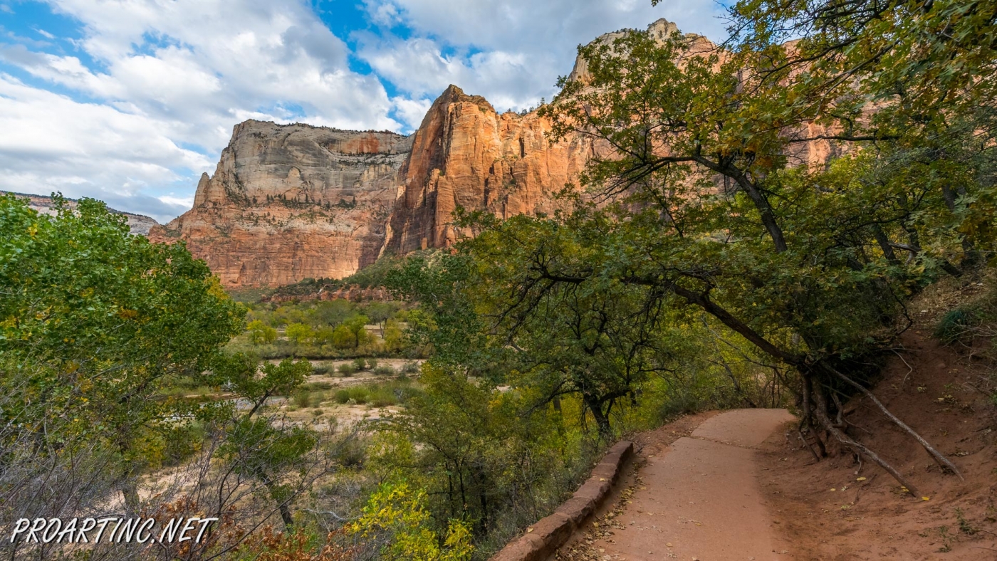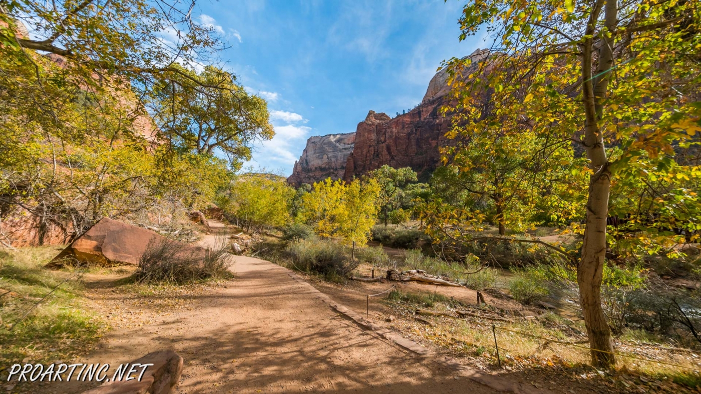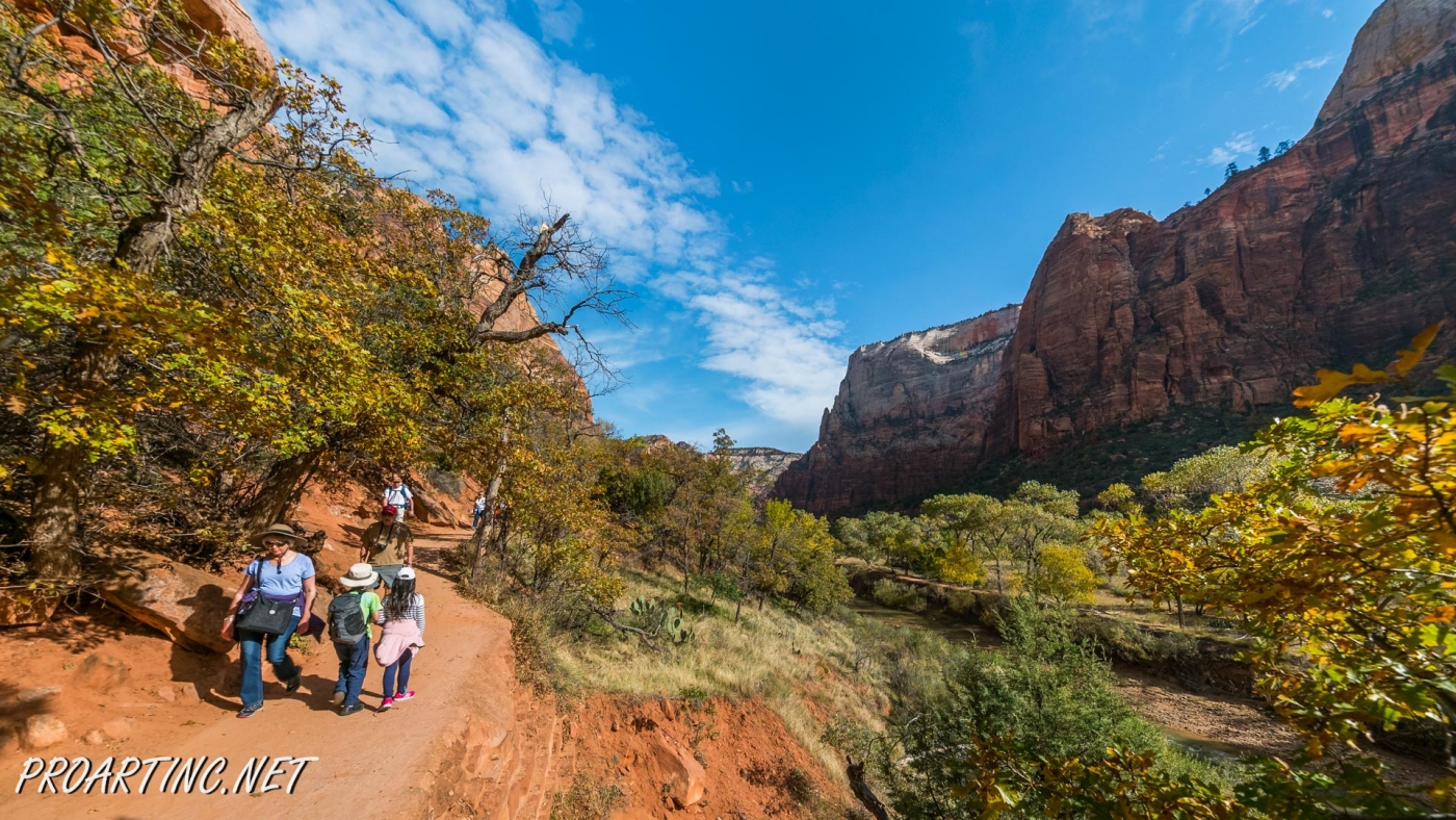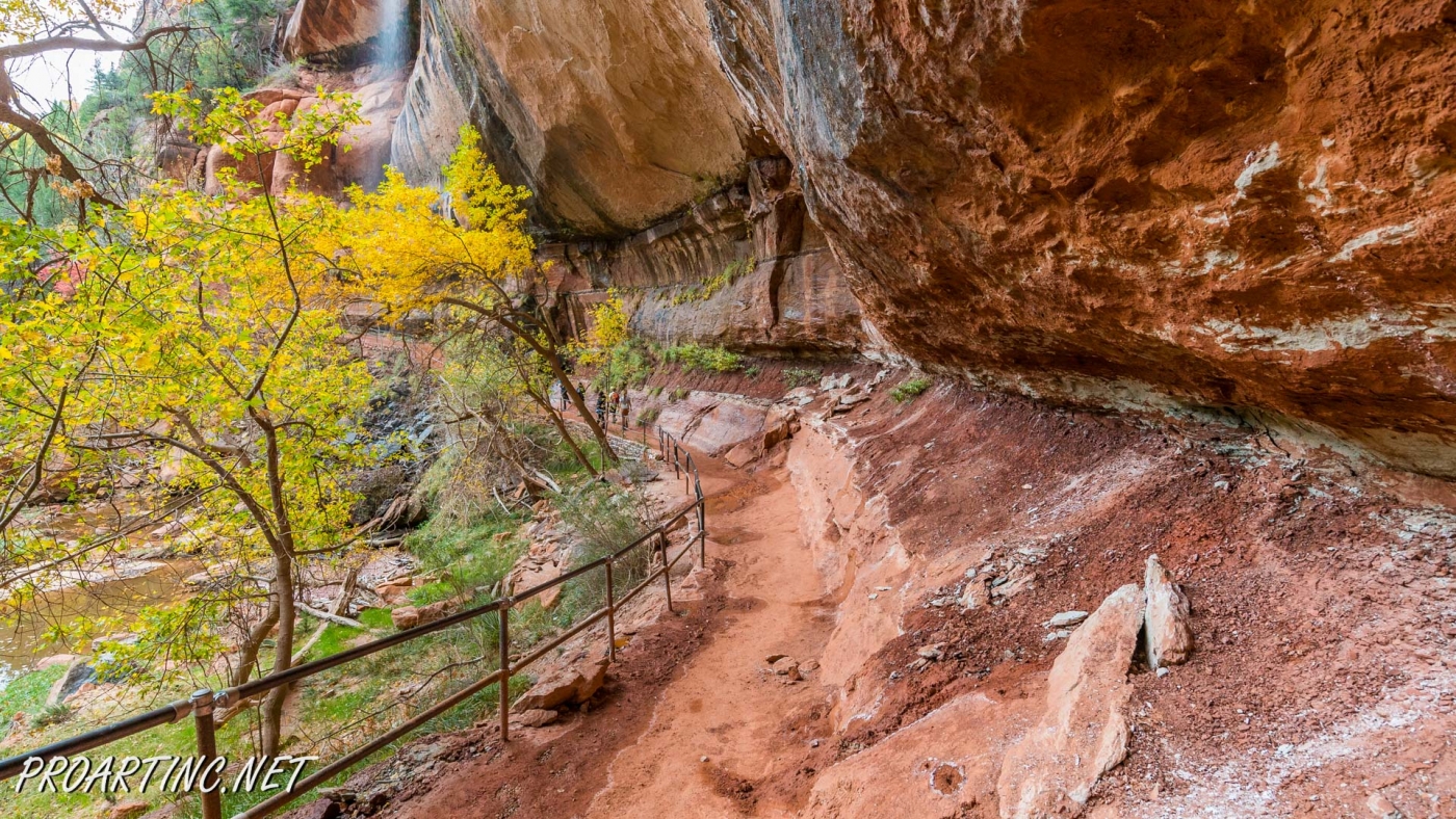 After leaving the Lodge you will need to cross the footbridge over the Virgin River and for some time (for approximately half a mile) the trail parallels the river. Enjoy the hike along a paved, shady part of the trail listening to the calming sounds of the flowing river and soaking in the great views of the canyon.