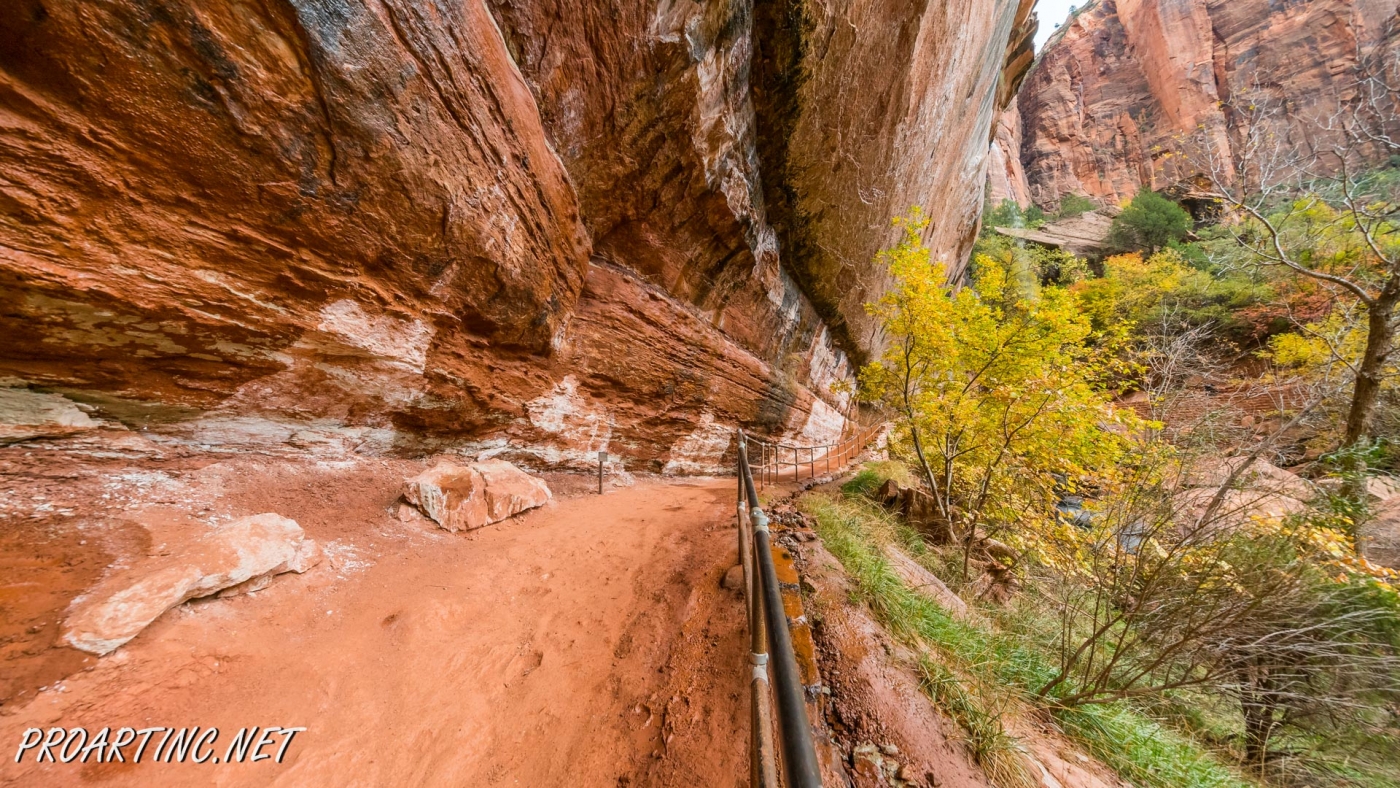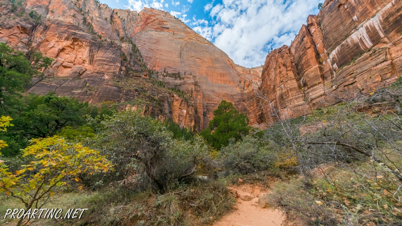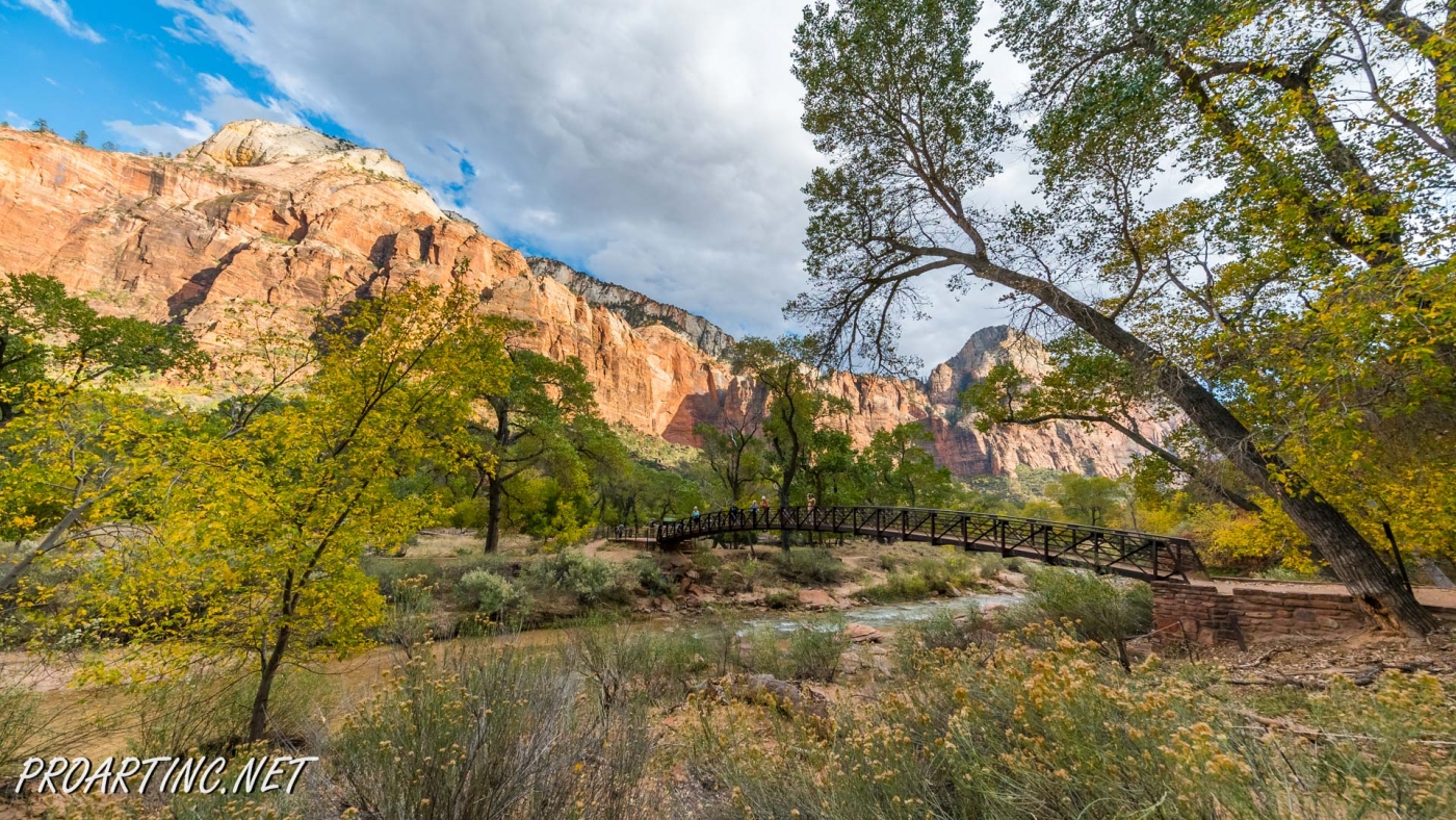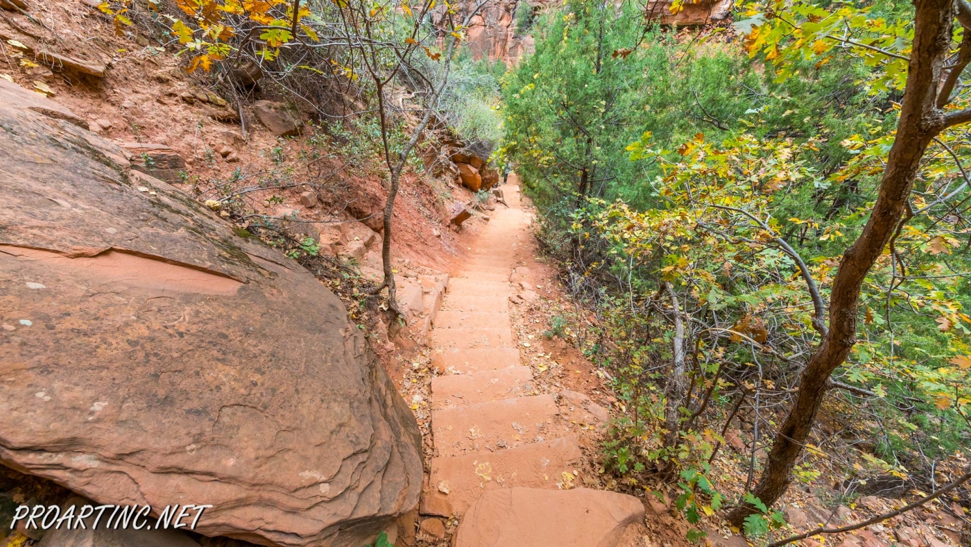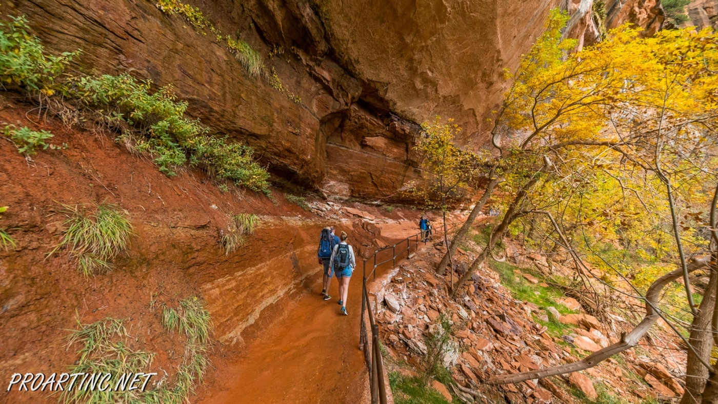 After leaving the Lodge you will need to cross the footbridge over the Virgin River and for some time (for approximately half a mile) the trail parallels the river. Enjoy the hike along a paved, shady part of the trail listening to the calming sounds of the flowing river and soaking in the great views of the canyon.
